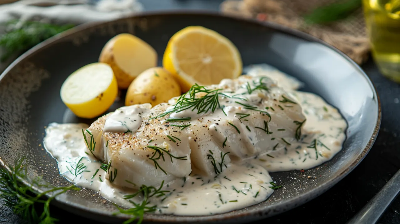 - Sos śmietanowy z nutą cytryny i koperku doskonale komponuje się z delikatnymi płatami dorsza.